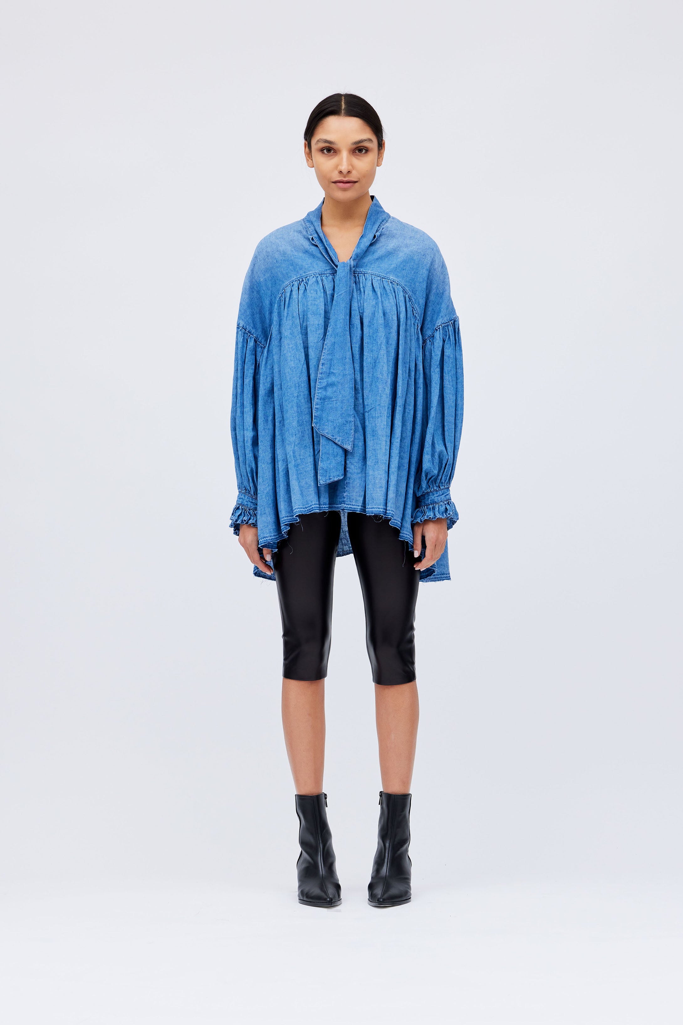 "Anamone" Oversized Voile Pleated Top in Lightweight Indigo Linen