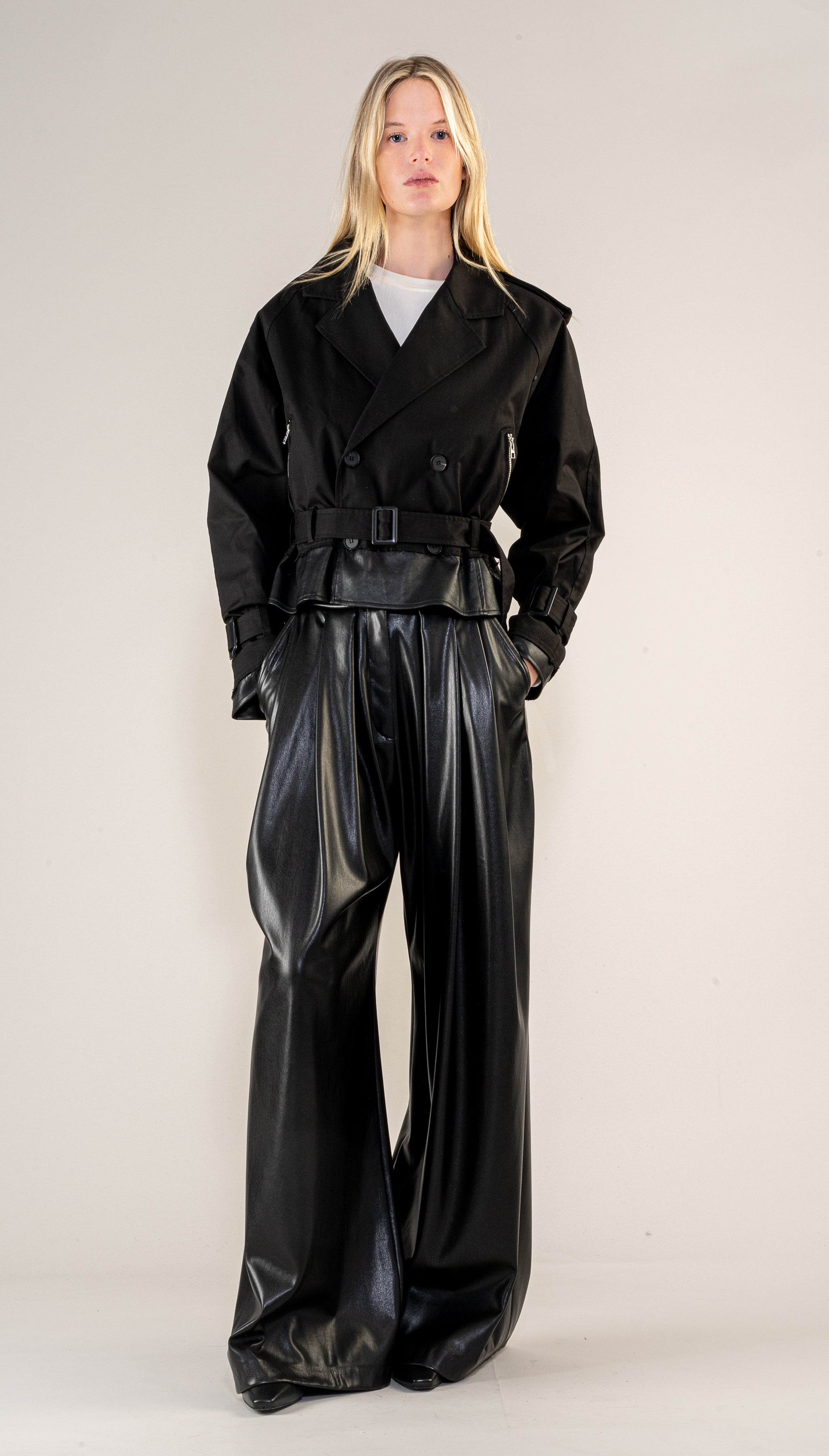 "Bryn" Front-Wrap Cropped Trench Coat W/ Vegan Leather Detail at Hem