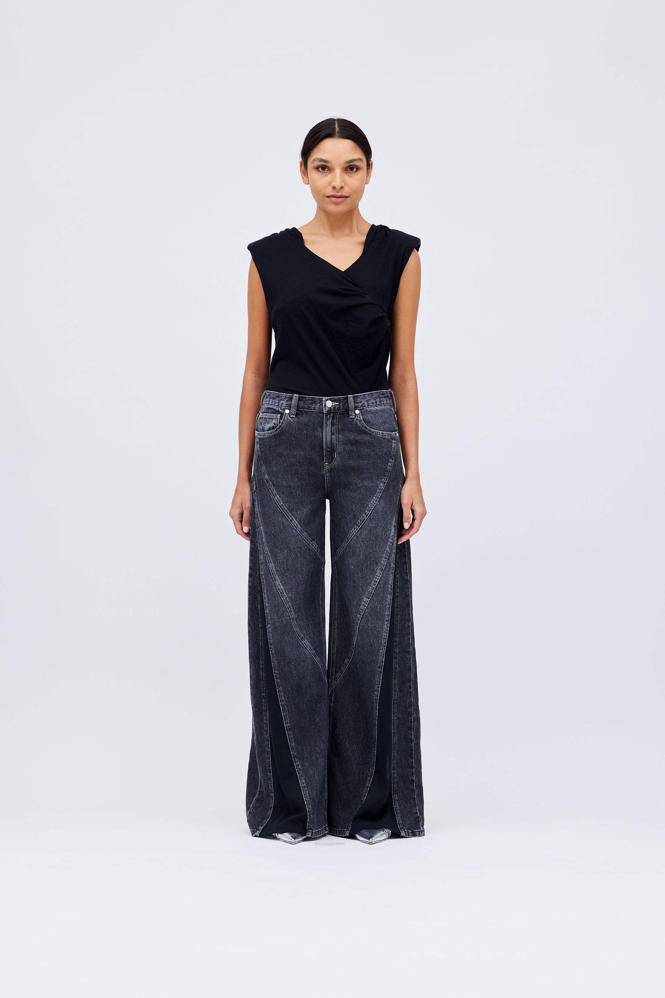 "Nolan" Mid Rise Low Slung Wide Leg W/Multi Seaming Detail in Faded Black-Wash denim
