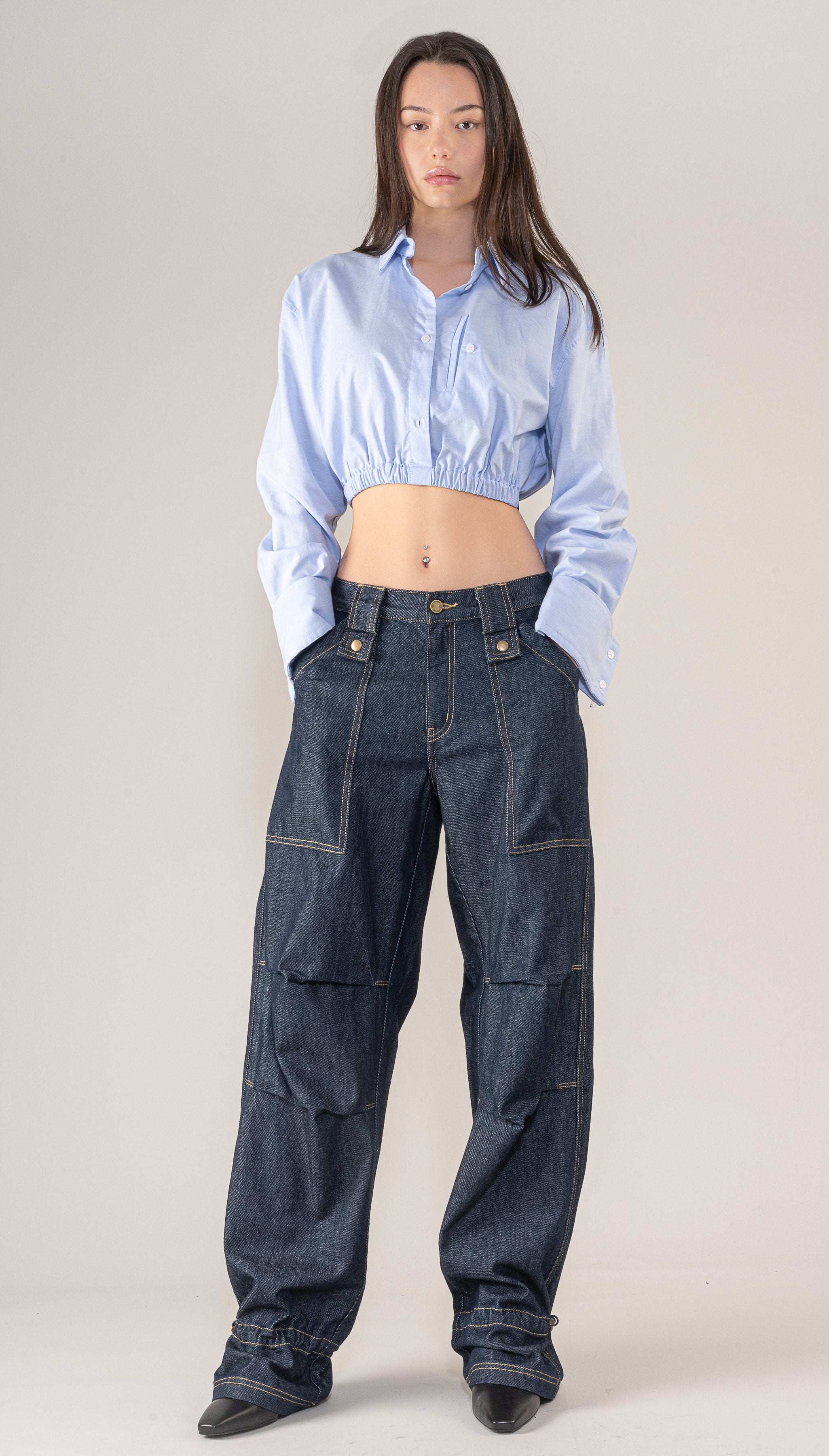 This Utility jeans made of dark rinsed denim, with a balloon silhouette with side pockets, cargo pockets and a back flap pocket, hook and hidden zip closure.