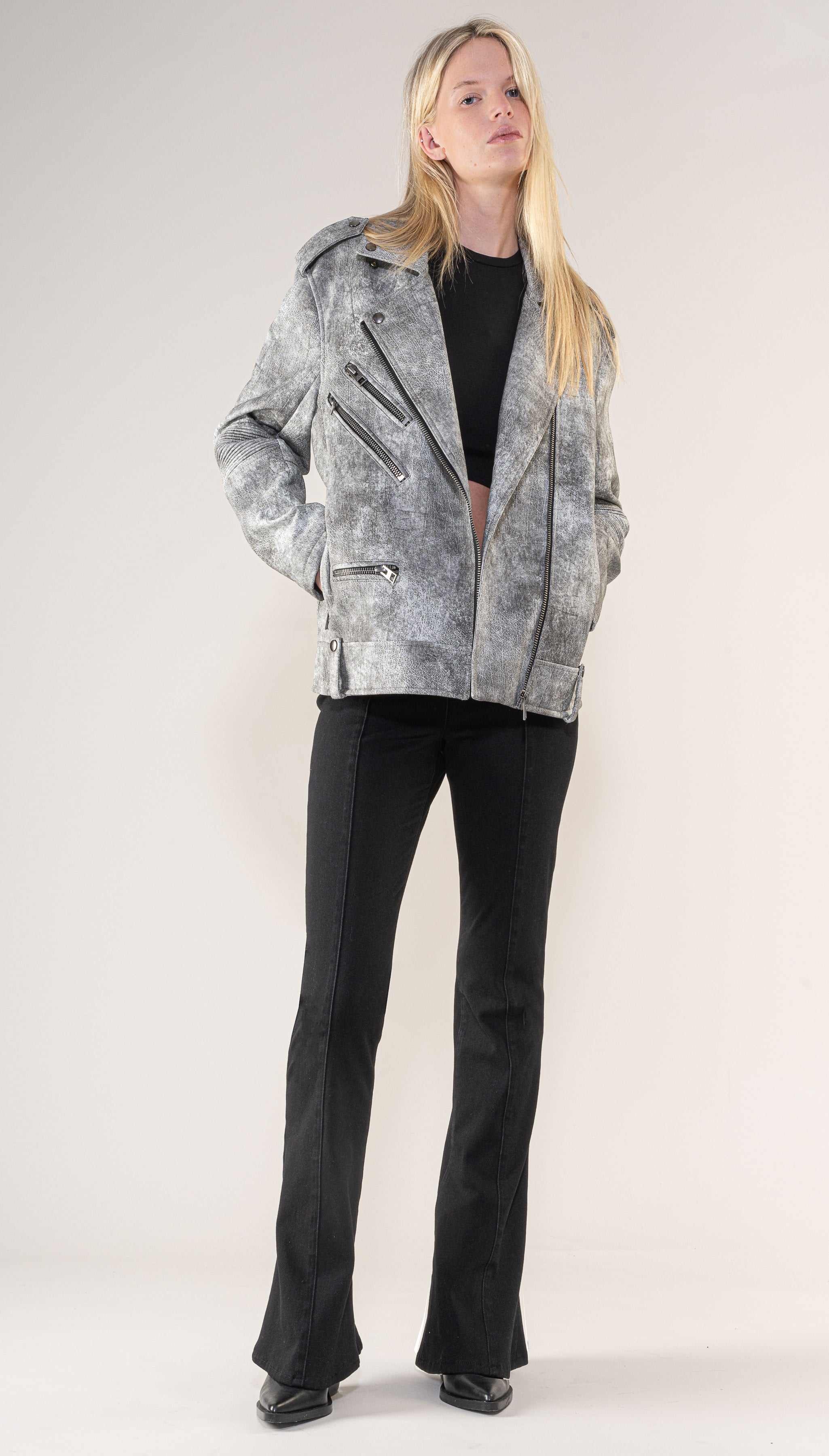 This Motorcycle jacket features an Oversized silhouette crafted of Vegan Leather. Zip pockets.