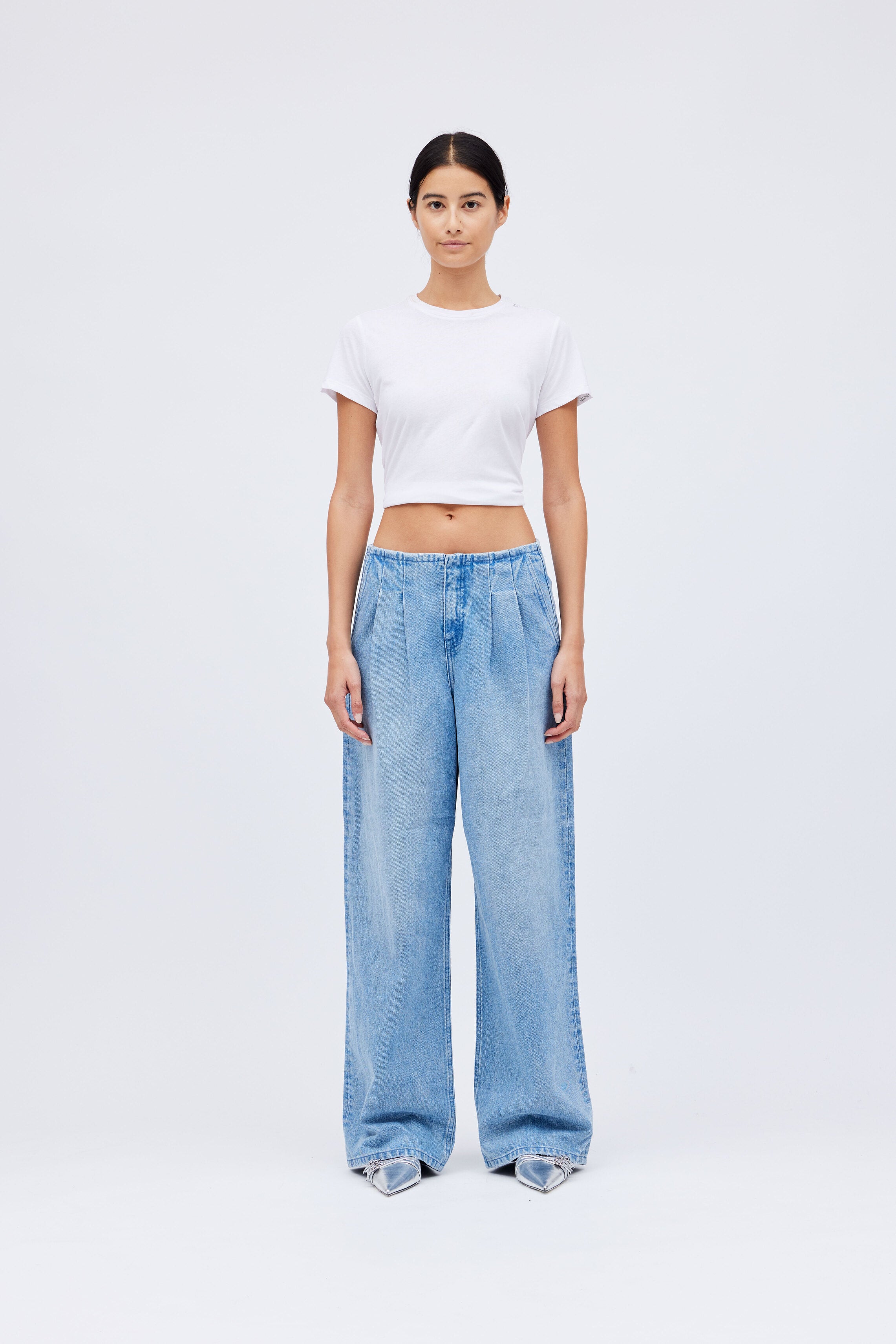"The Tatum" Mid-Rise Wide Leg Pleated No Waistband Trouser in light-wash denim