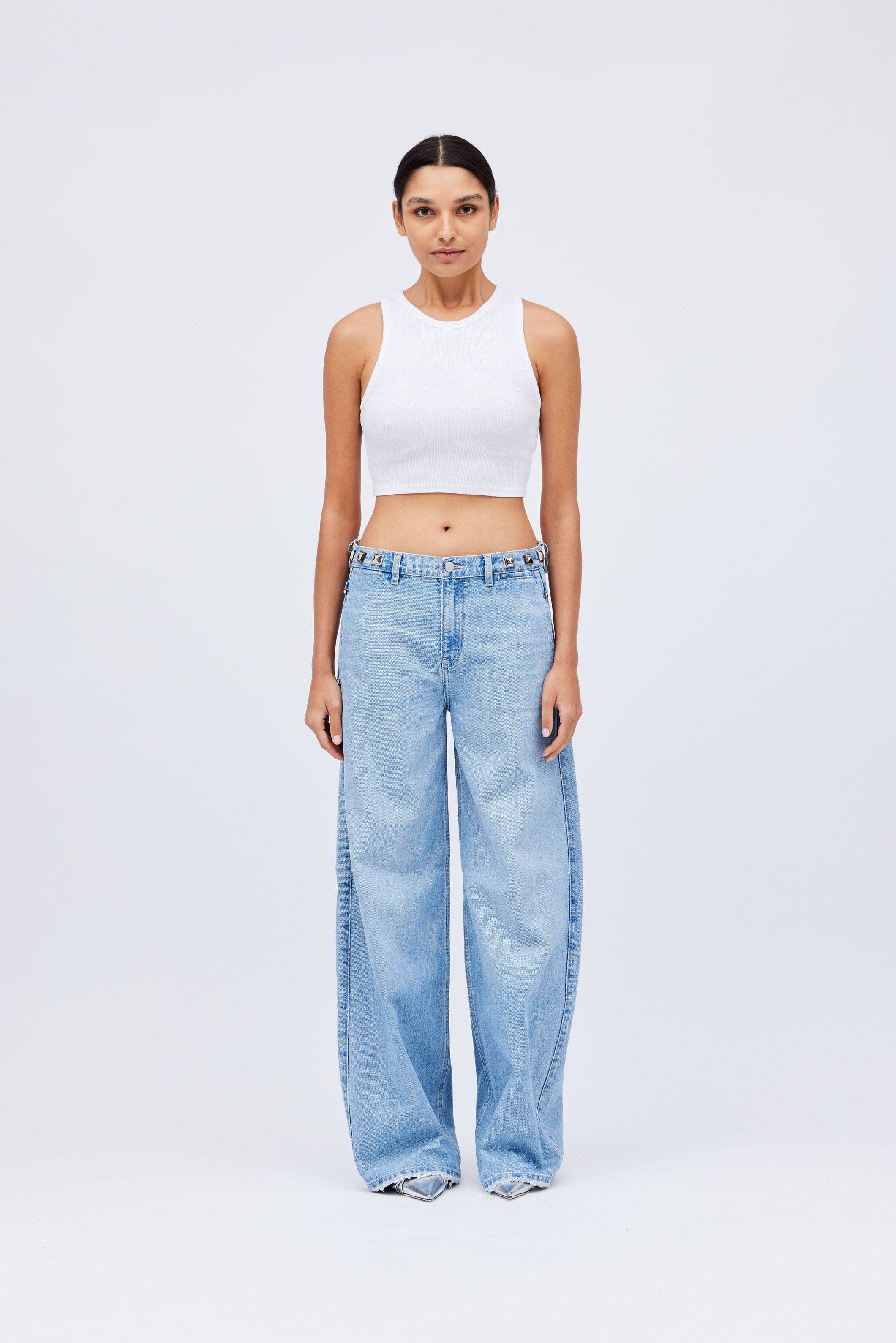 "The Hipster" Low Slung Flat Front Wide Leg Trouser w/Studded W/B detail.