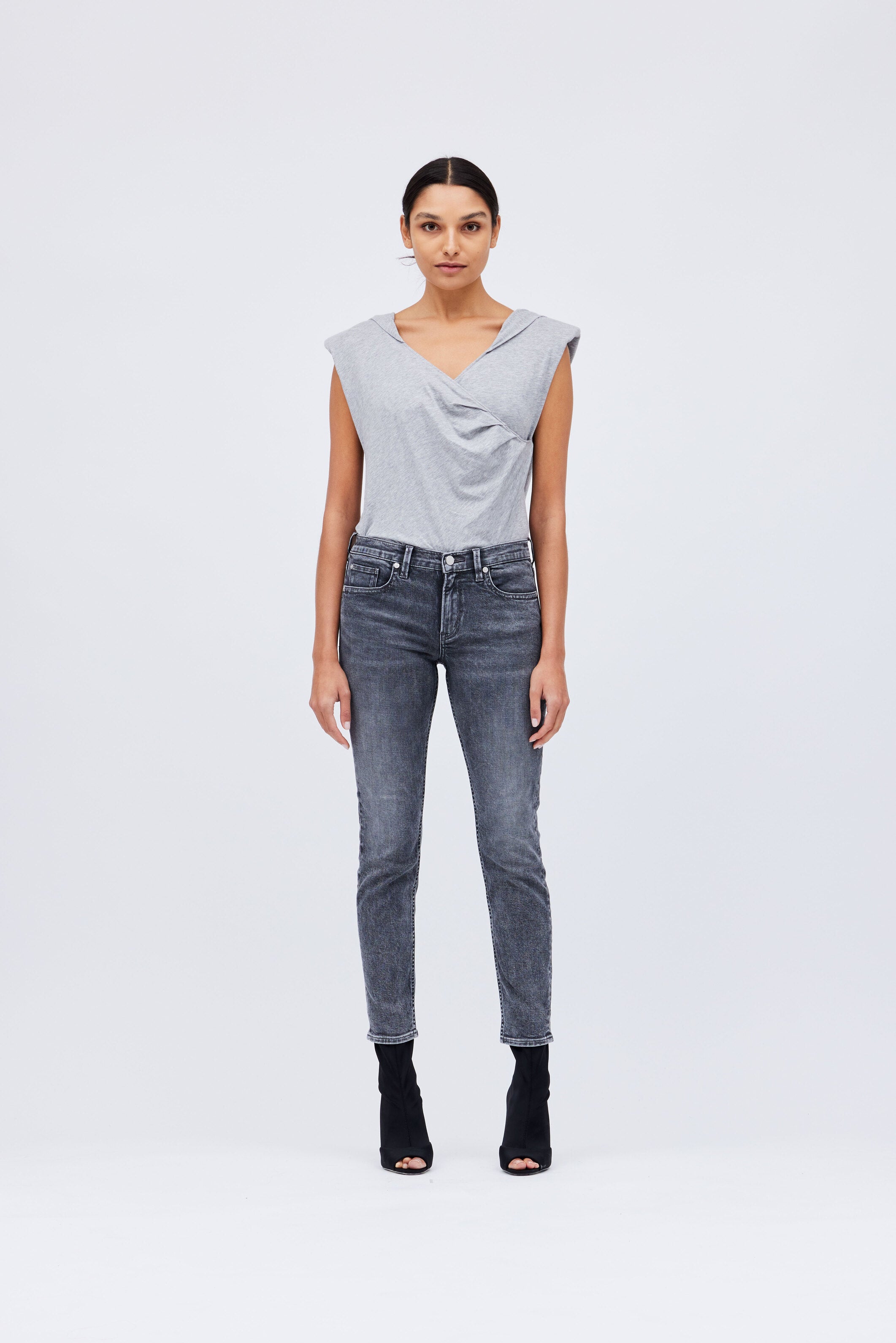"Not That Low" Low-Rise Ankle Length Skinny Jeans in Faded Dark Grey-Wash denim