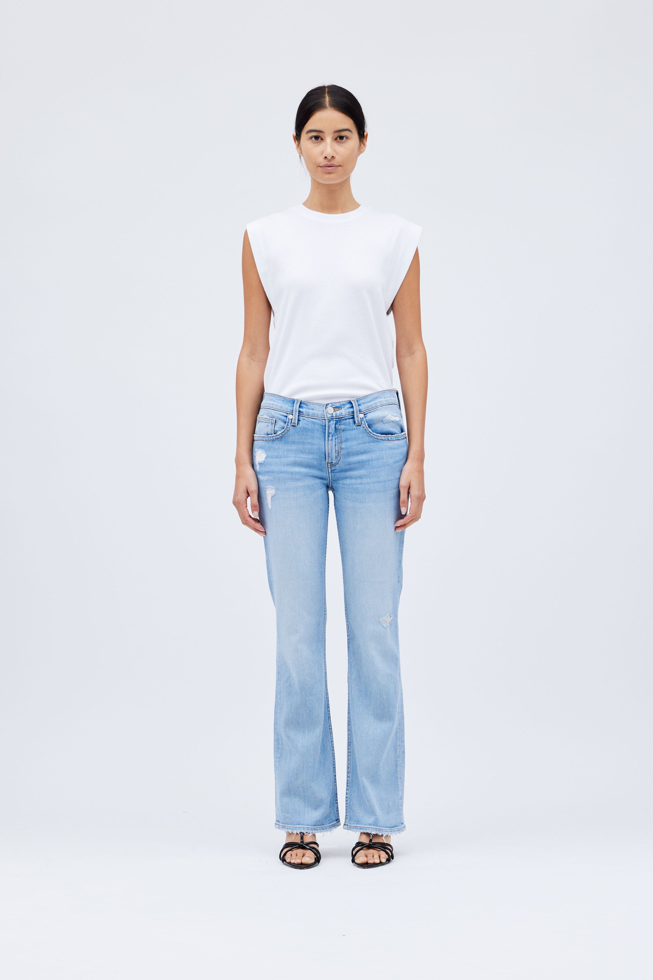 "The Seraphina" Distressed Low-Rise Flare Jeans in faded Light-Wash denim.