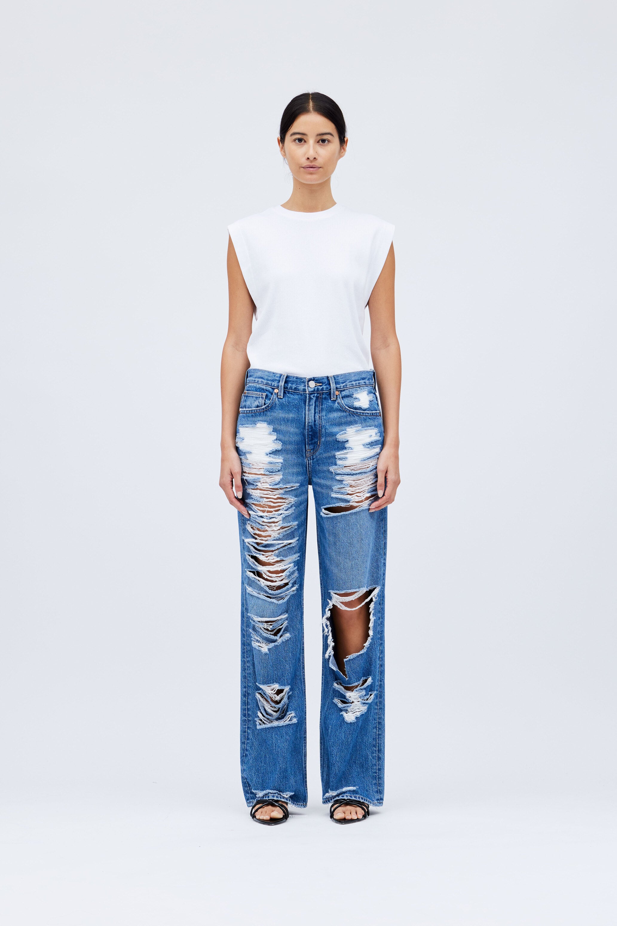 "The Smith" Mid-Rise Relaxed Straight Leg Jeans in faded Dark-wash with rips