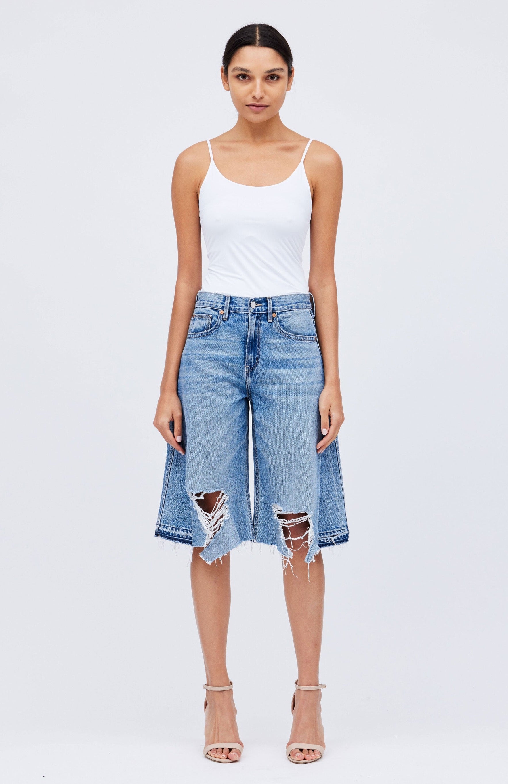"Collette" Culottes Denim Shorts in faded dark-wash with heavy destruction at front hem detail