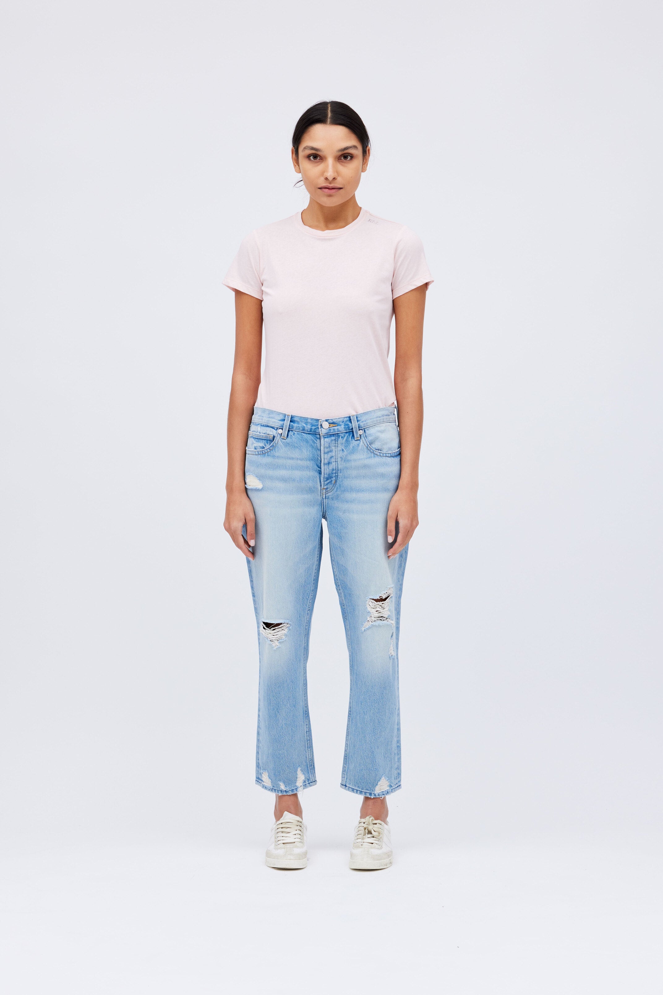 "The Boy Cut" Mid-Rise Denim Boyfriend. Distressed straight-leg jeans in a faded light-wash denim