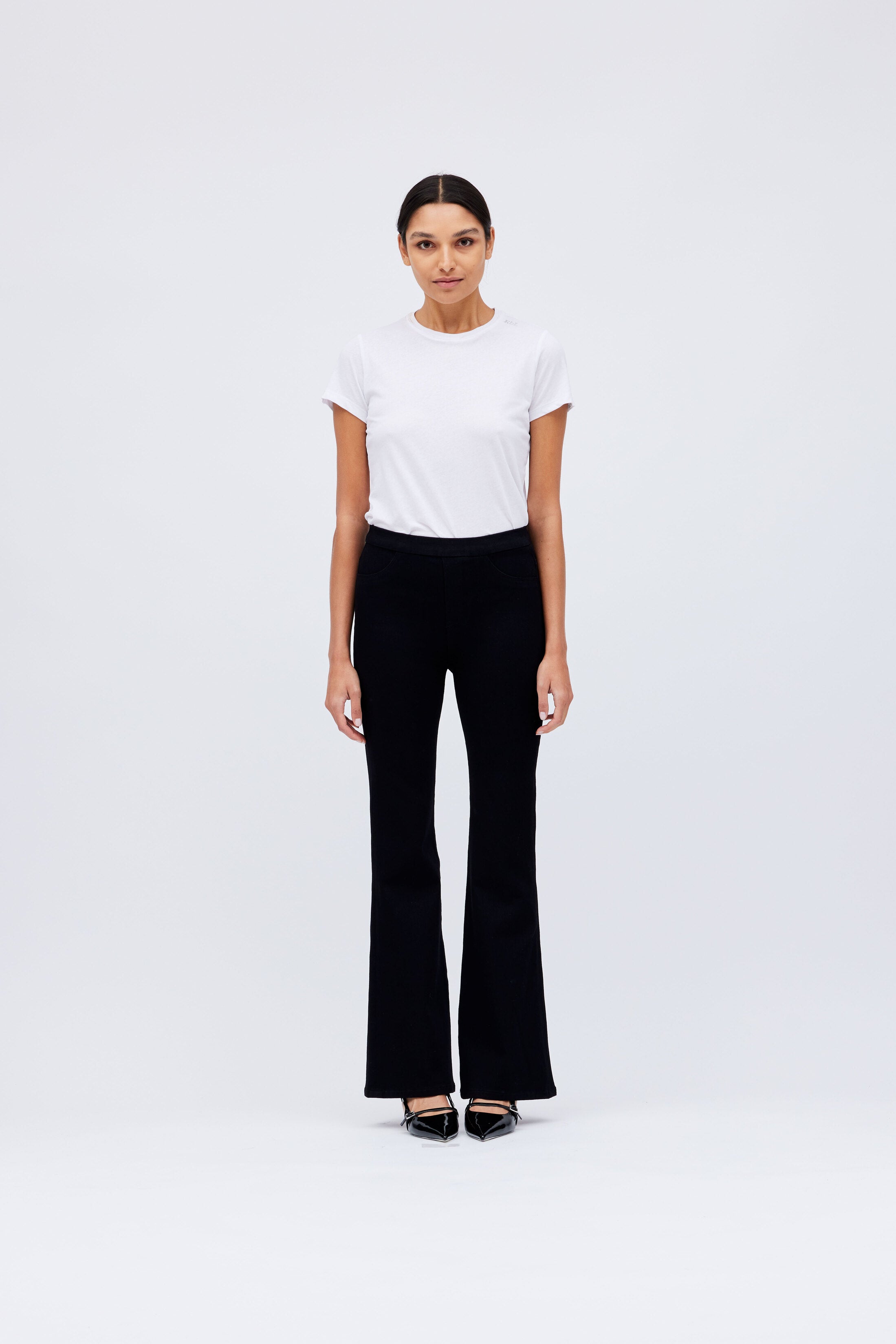 "The Wonder" High Rise Flare Pull-On Pants in Black-Wash, 4 Way Stretch Denim