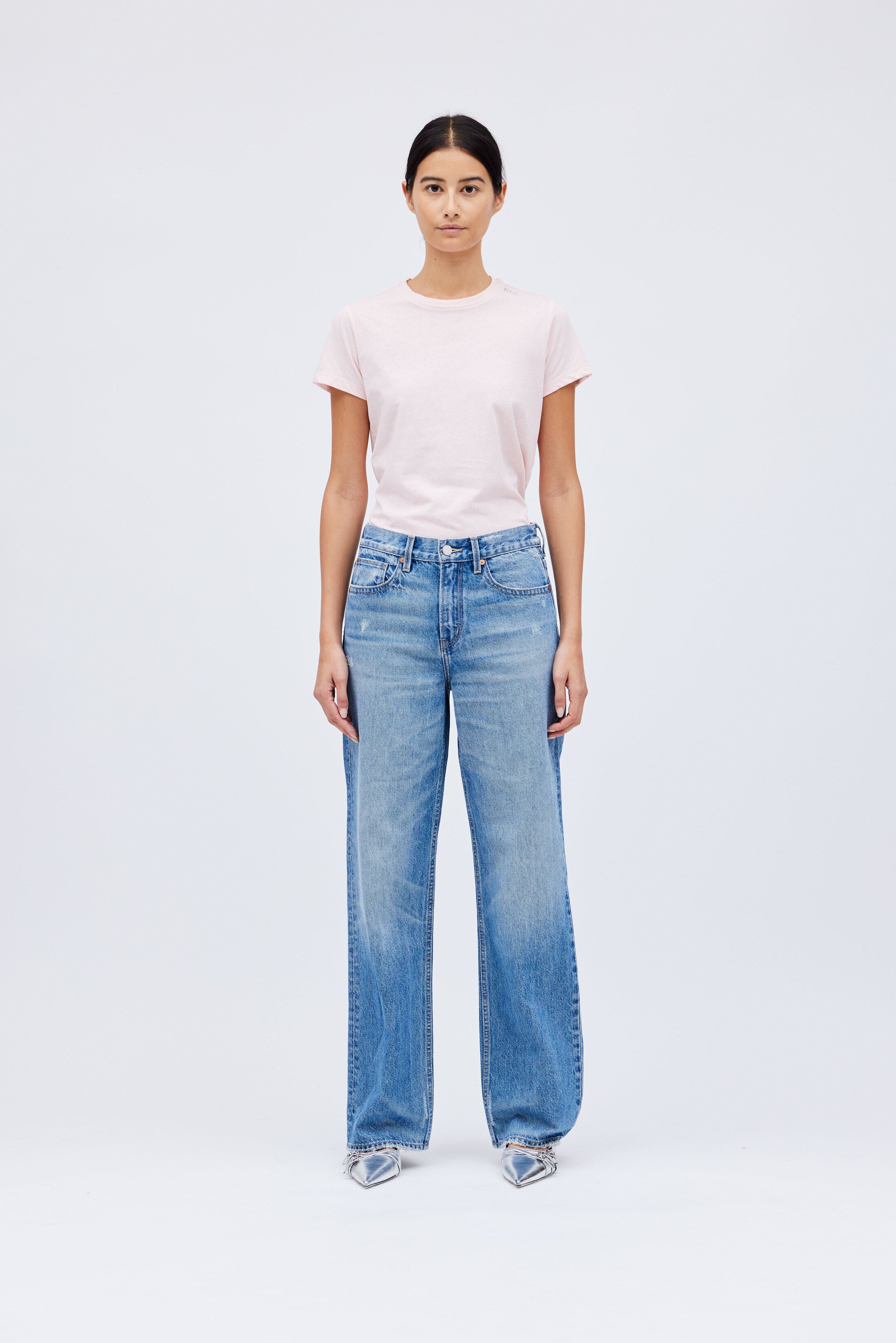 "The Smith" Mid-Rise Relaxed Straight Leg Jeans in faded light-wash with light distressed