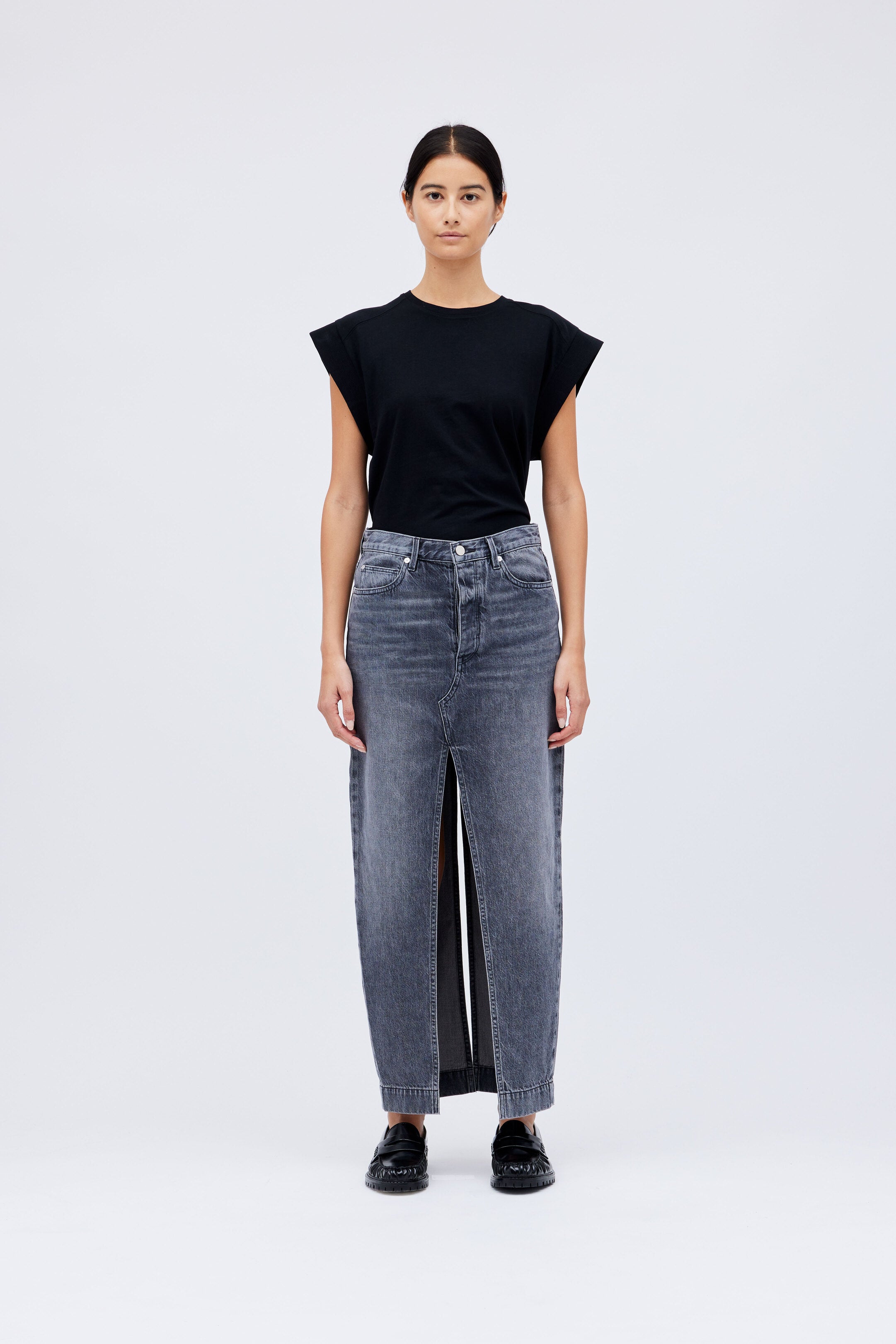 "Litty" Mid-Rise Maxi Denim Skirt with Front and Back Slit in faded dark grey-wash