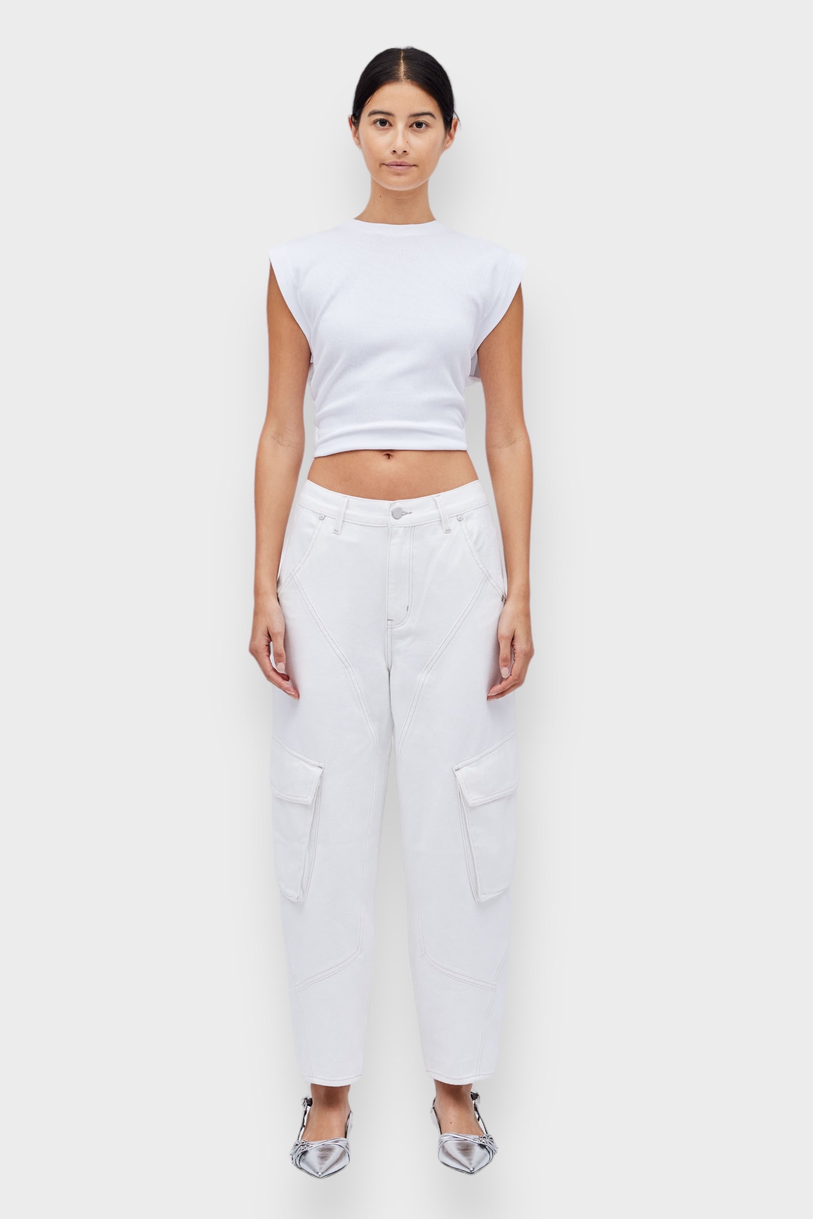 This Cargo Jeans made of White twill denim, with a balloon silhouette with side pockets, cargo pockets and a back flap pocket, hook and hidden zip closure.