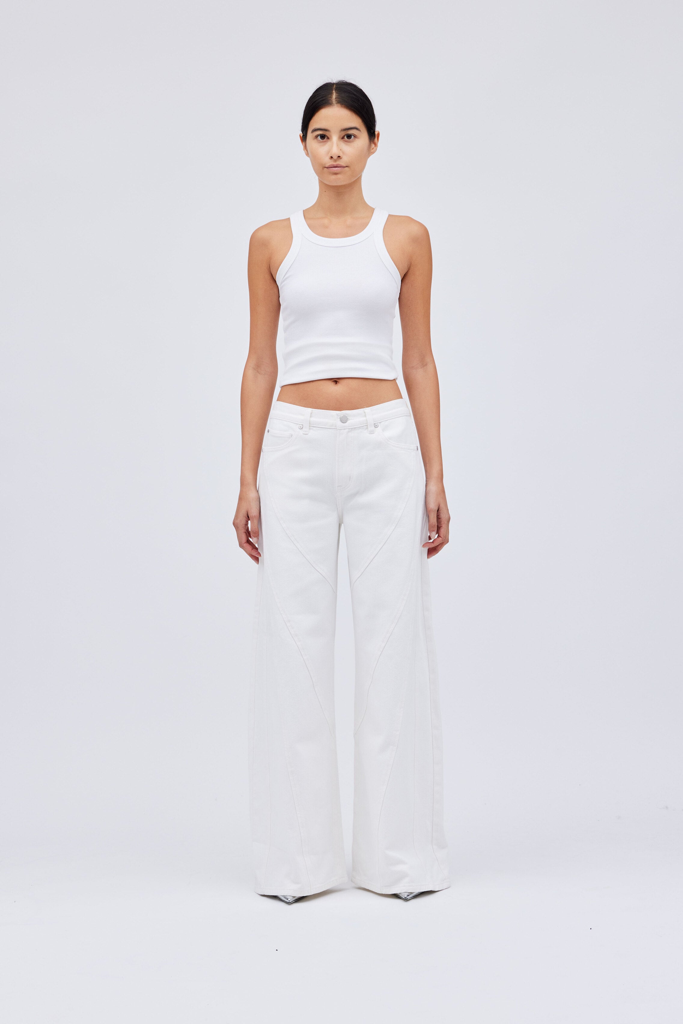 "Nolan" Mid Rise Low Slung Wide Leg W/Multi Seaming Detail in white twill denim