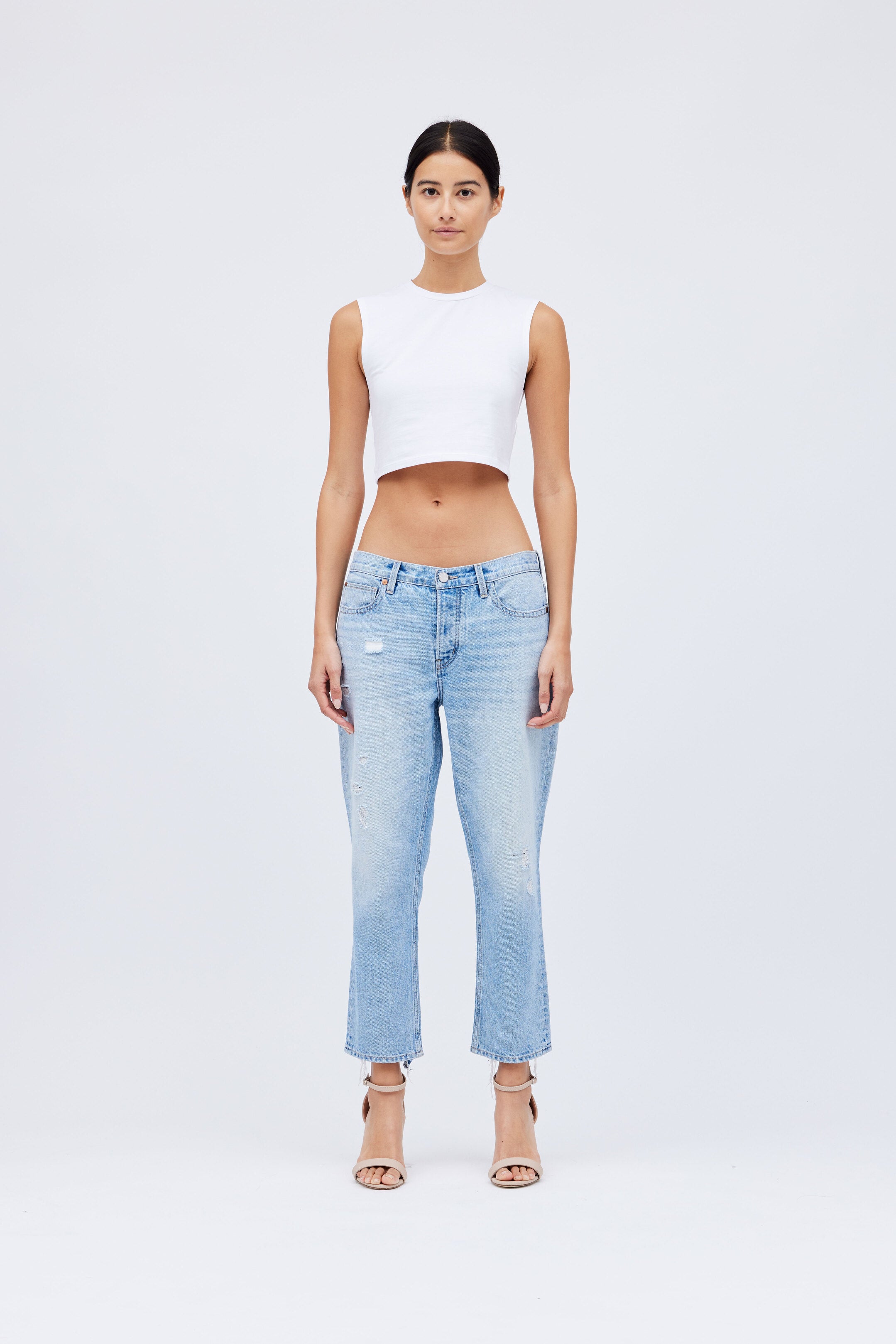 "The Boy Cut" Mid-Rise Denim Boyfriend. Distressed straight-leg jeans in a faded light-wash denim  Approx. measurements : 10.5"...