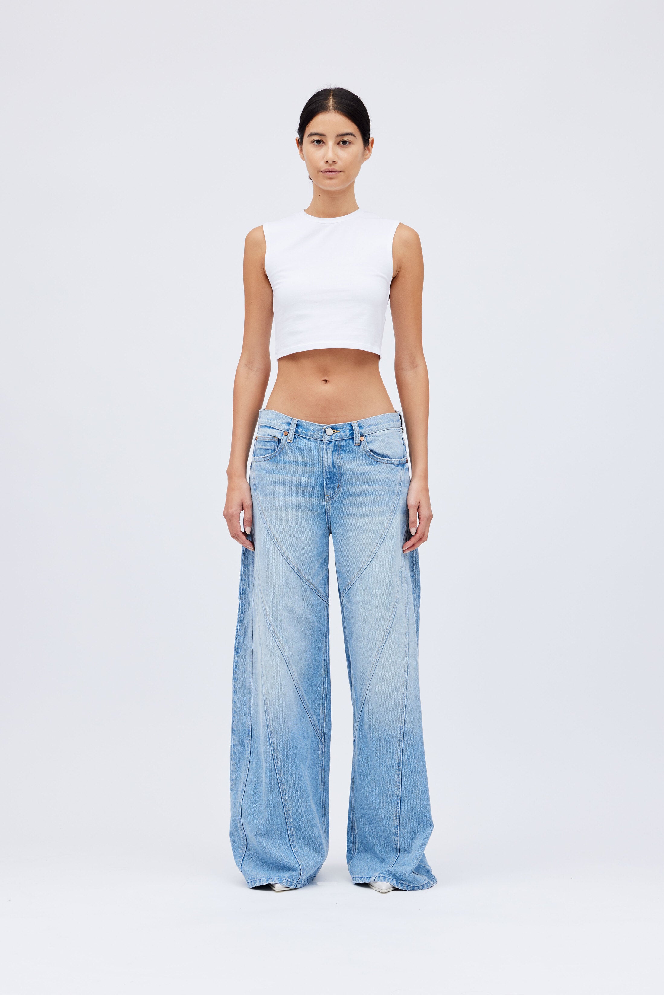 "Nolan" Mid Rise Low Slung Wide Leg W/Multi Seaming Detail in faded light-wash denim