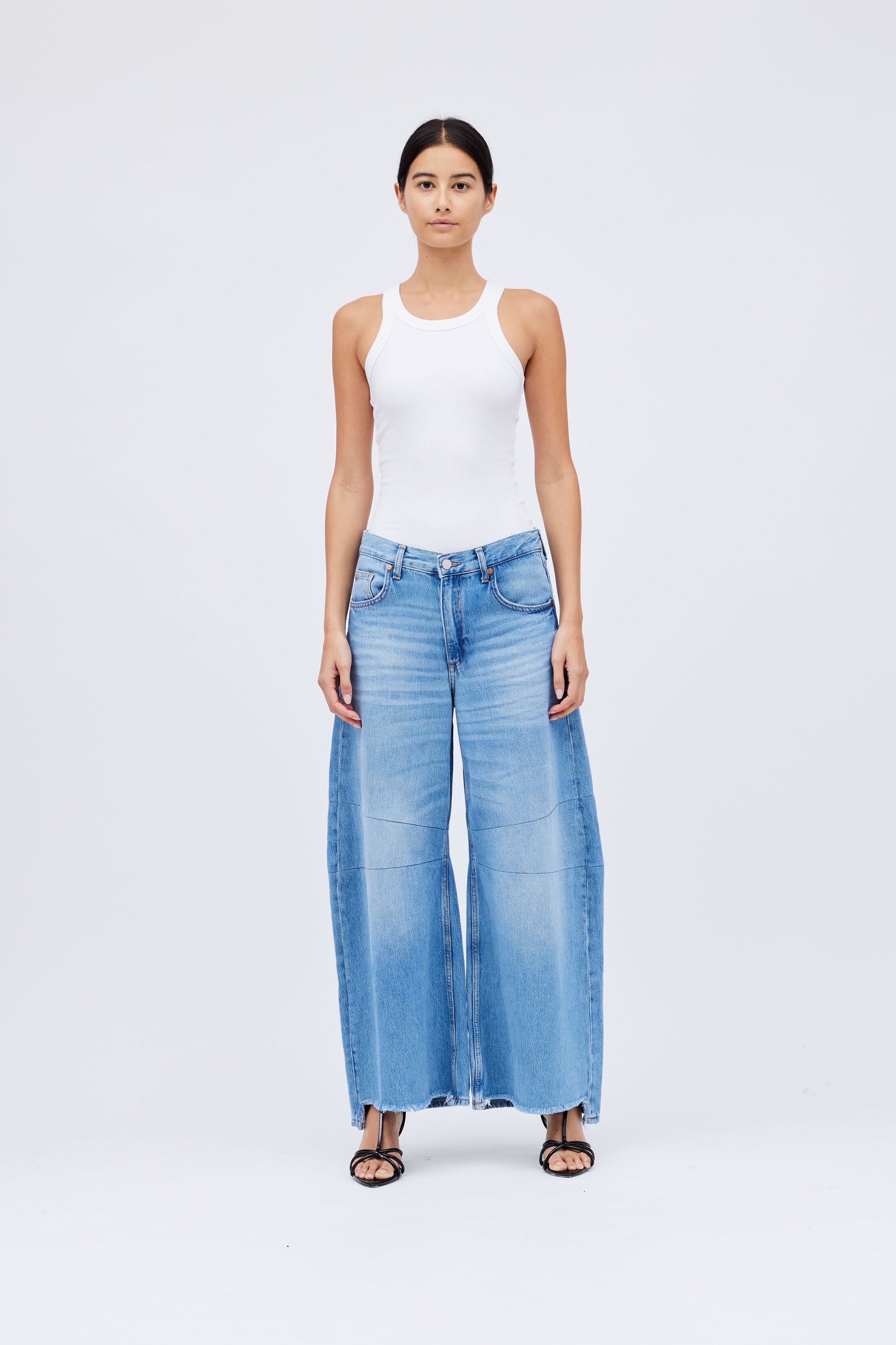 "Horsing Around" Horseshoe Jeans in medium wash denim with a curved leg shape and fray hems