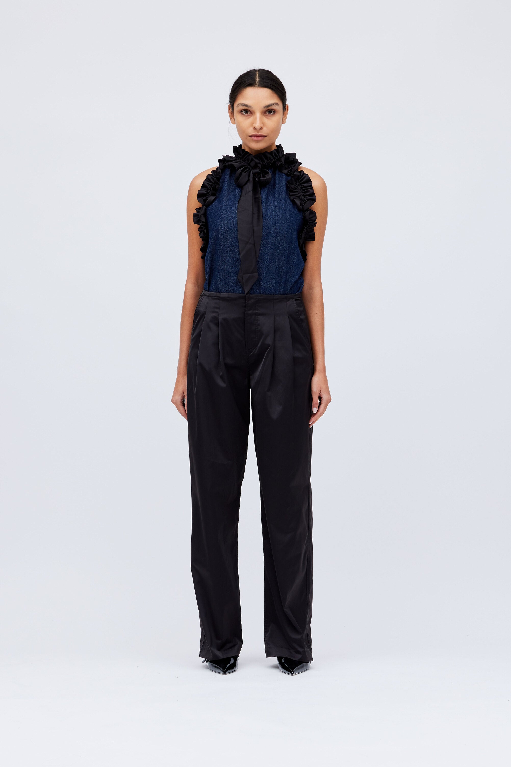 "Celina" Halter Racer Back Top With Silk Ruffle Detail in dark indigo denim
