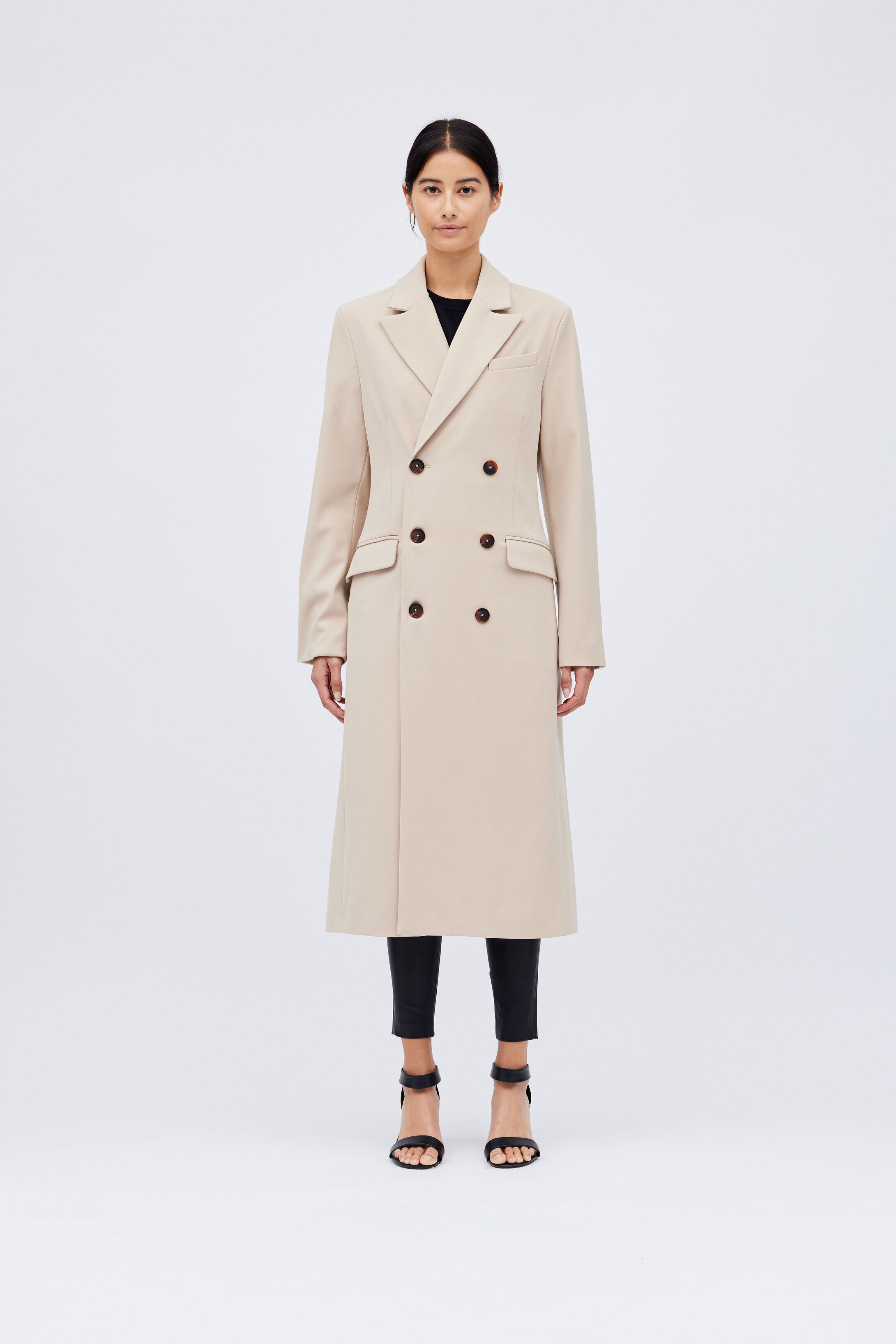 "Finley" Double Breasted Twill Maxi Coat. It's defined by padded shoulders for added structure and has a sleek, double-breasted profile.