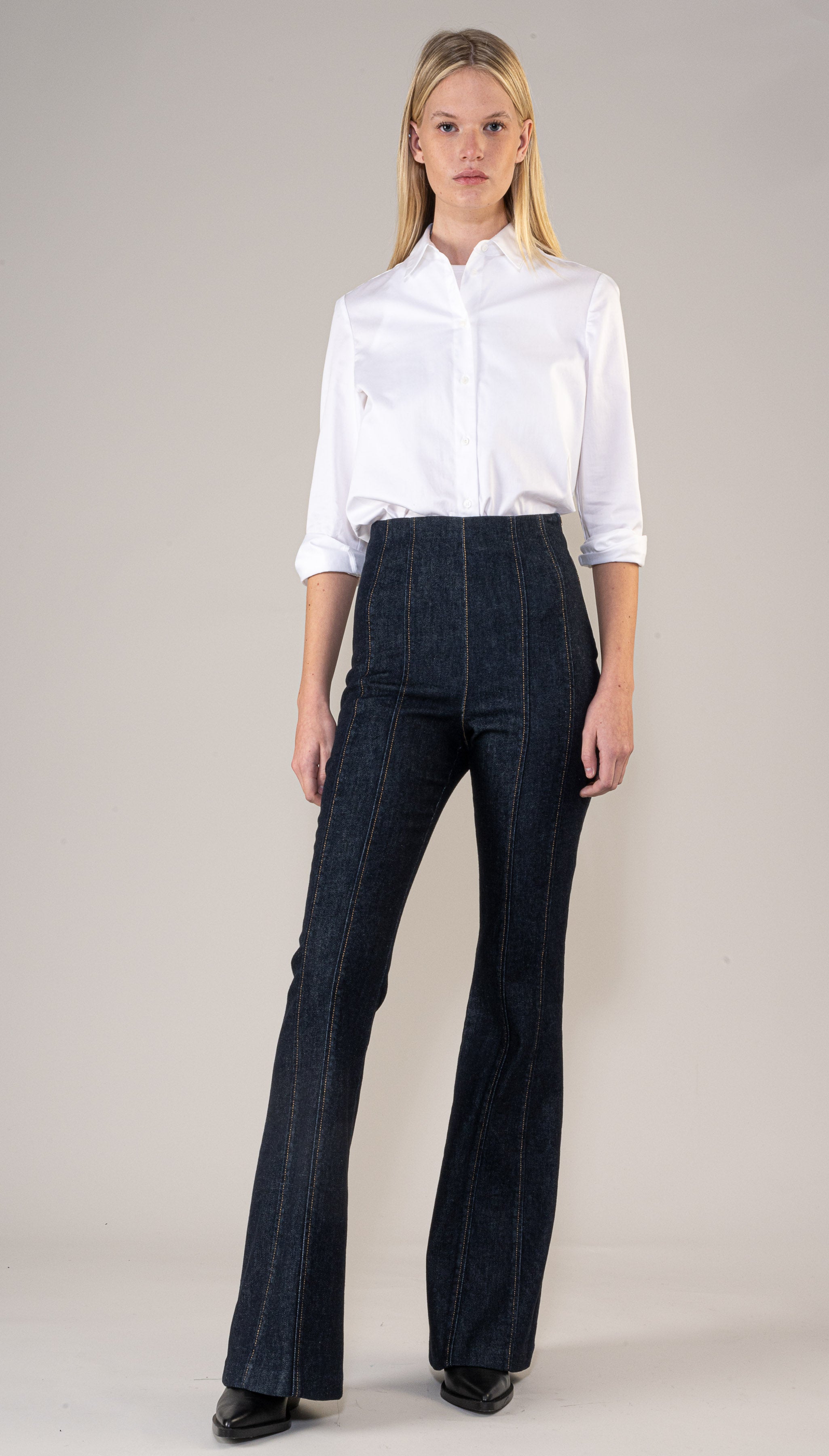 "Tara" Pull On Wide Leg Jeans feature multi-seaming down the front and back leg in 4 Way Stretch Dark Indigo-Wash Denim