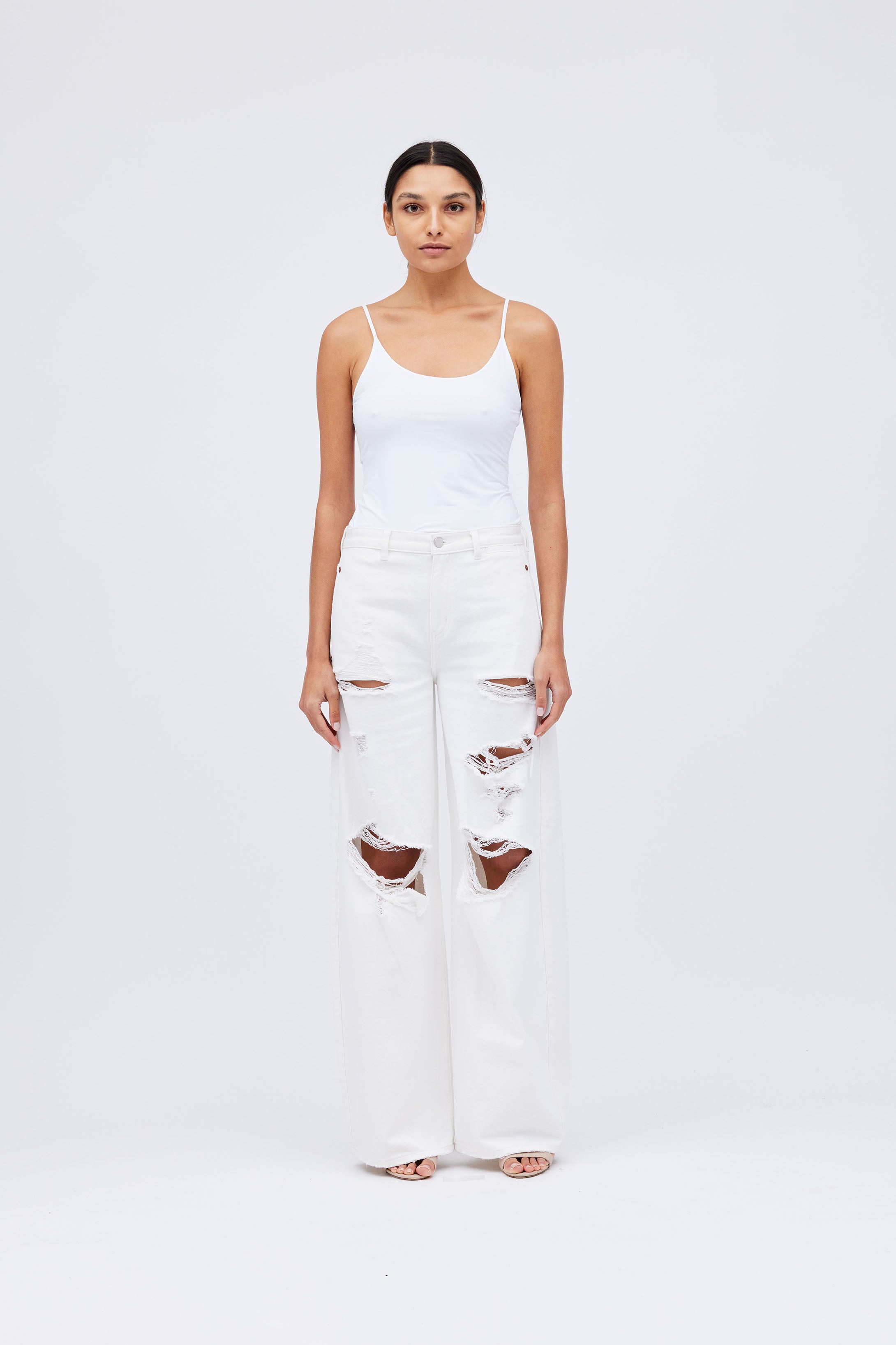 "The Hipster" Low Slung Flat Front Wide Leg Trouser w/Studded W/B detail in White Twill Denim.