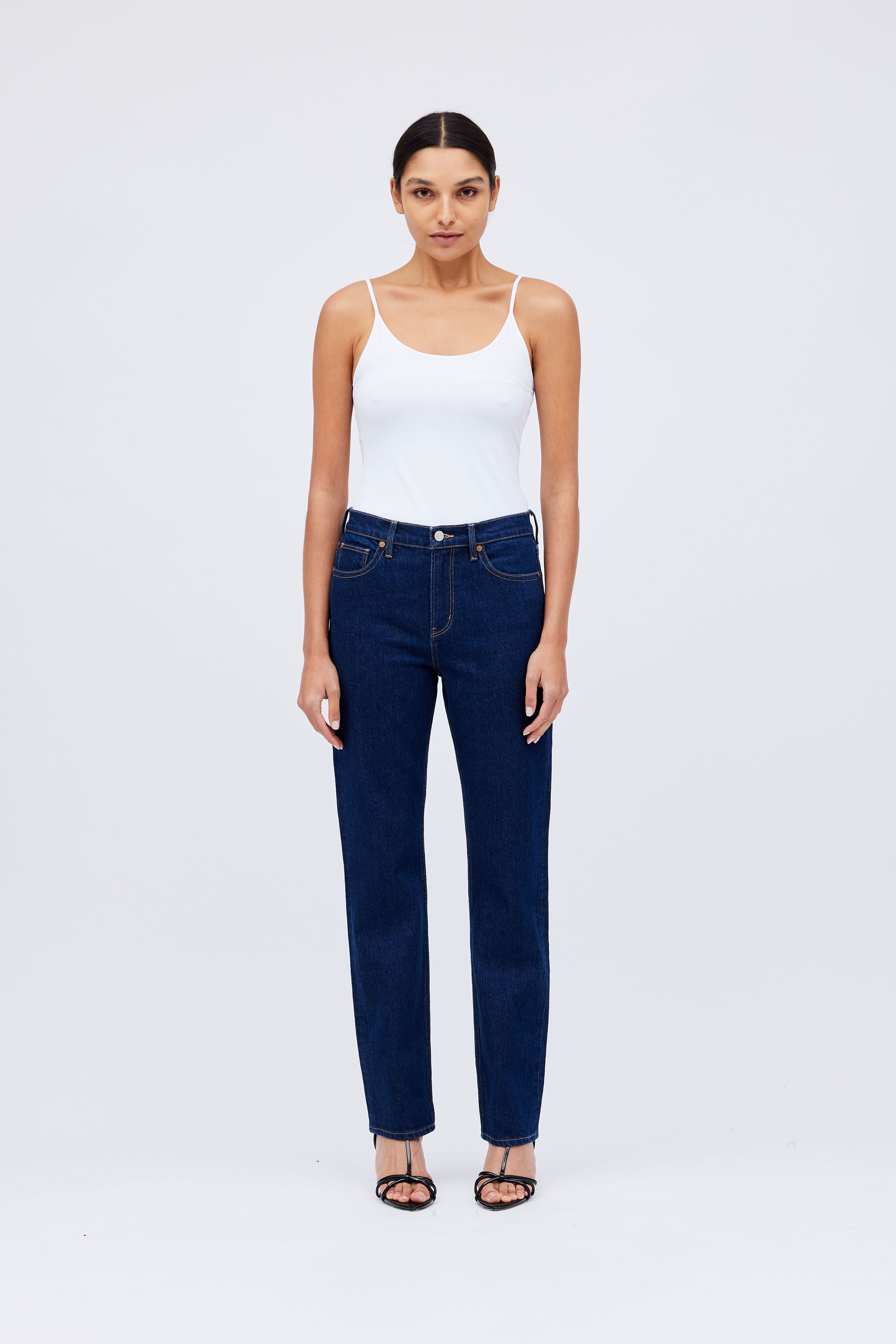 "The Maxine" Mid-Rise straight-leg jeans in Dark-wash comfort stretch-denim  Approx. measurements : 11" rise ,30.5" inseam ,...