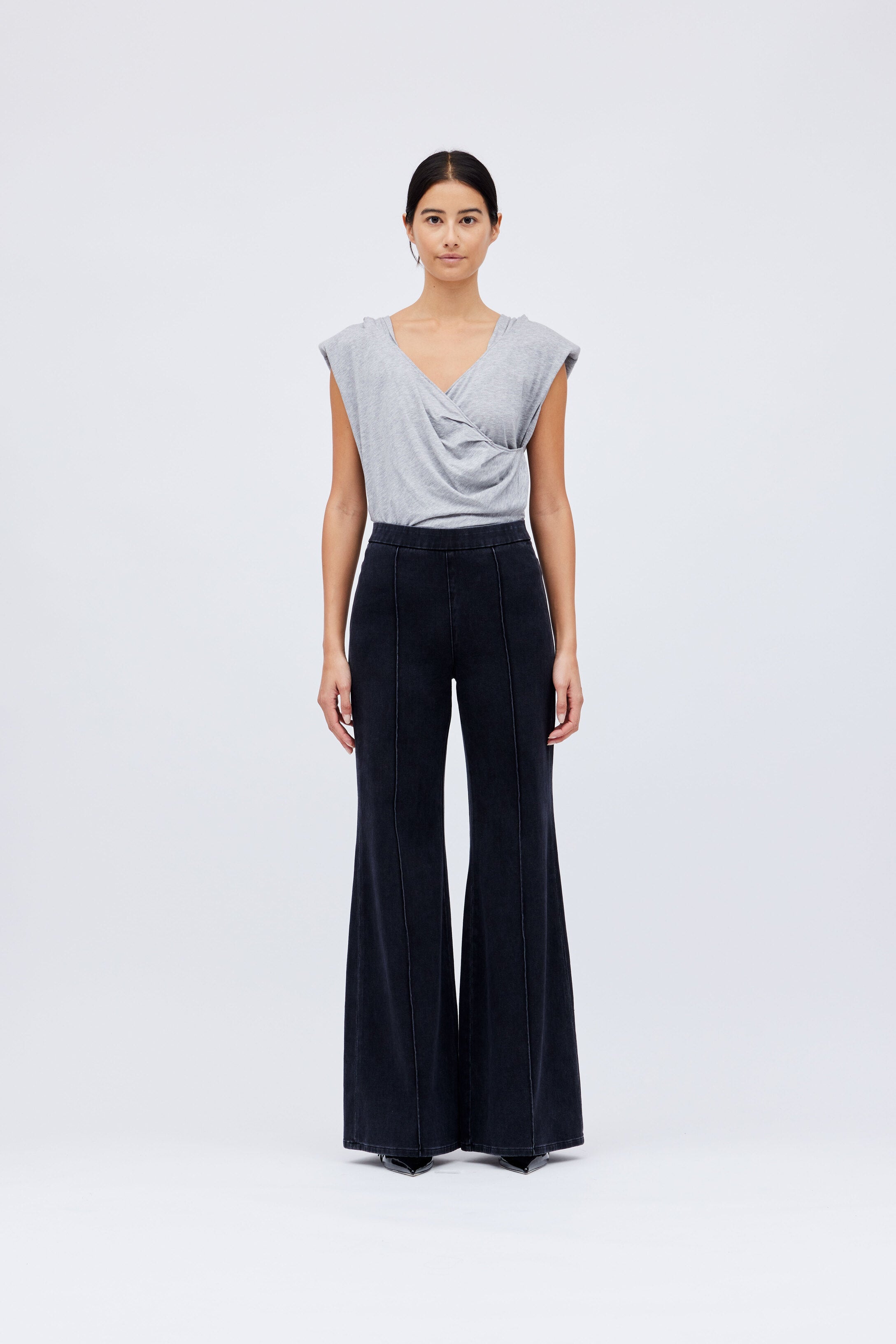 "The Vixen" Pull On Wide Leg pants feature pintuck down the center front leg in 4 Way Stretch Black Denim